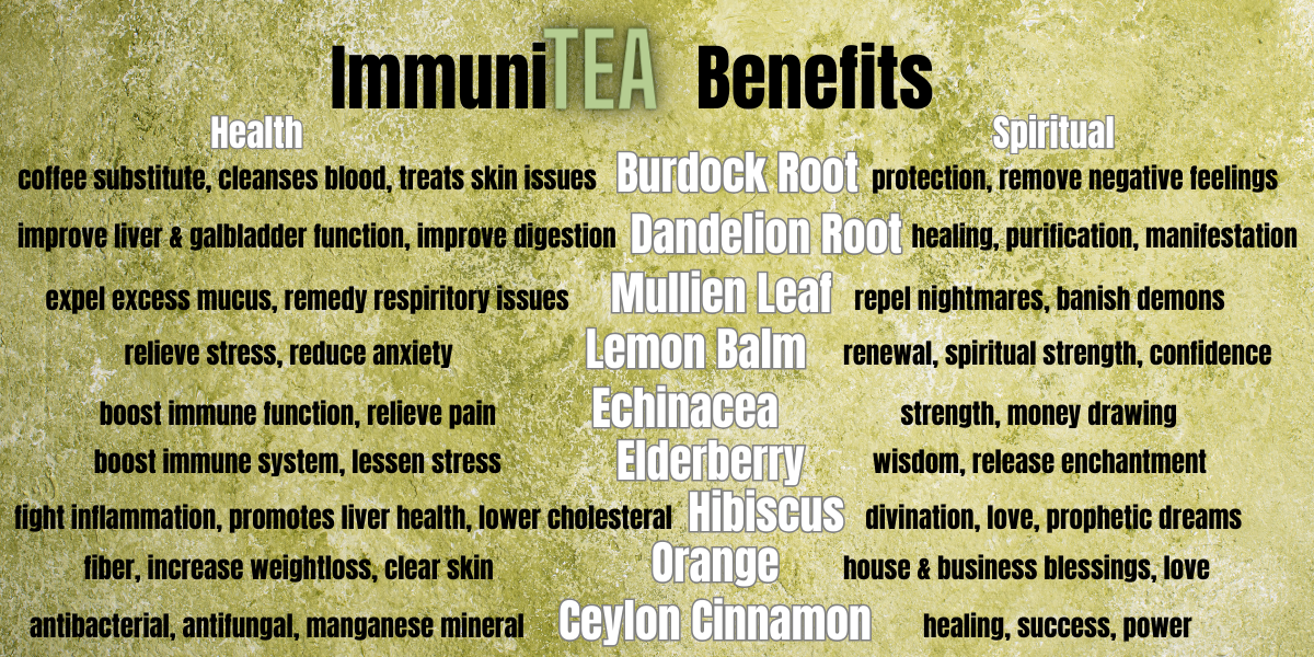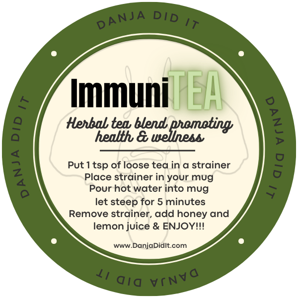 ImmuniTea is a hand-made herbal tea blend crafted with organic ingredients to support your immune system naturally. Created by Danja "The Positivity Plug," a wellness coach who fosters a safe space for personal transformation, this tea encourages both physical health and emotional balance. Sip with intention and nurture your well-being every day.